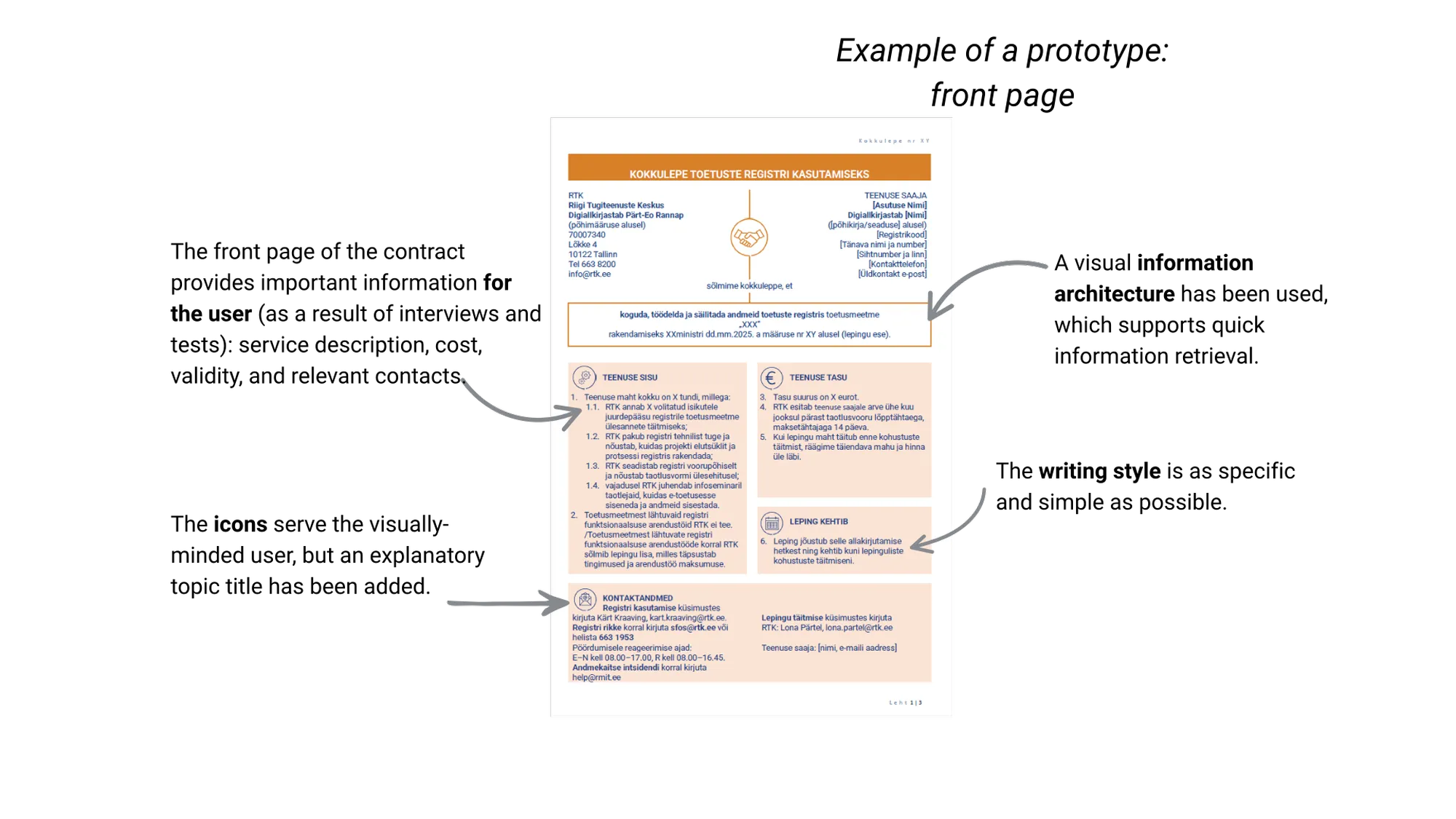 This raised a series of questions. Why are the service contracts needed? When and by whom are they read? Do the parties understand the provisions of the contract? These questions formed the problem statement when the team (Service Design Lead Lona Pärtel, IT Business Analyst Kriste Letta, and Lawyer Virge Pihel) began designing the SSSC’s first user-centric contract.