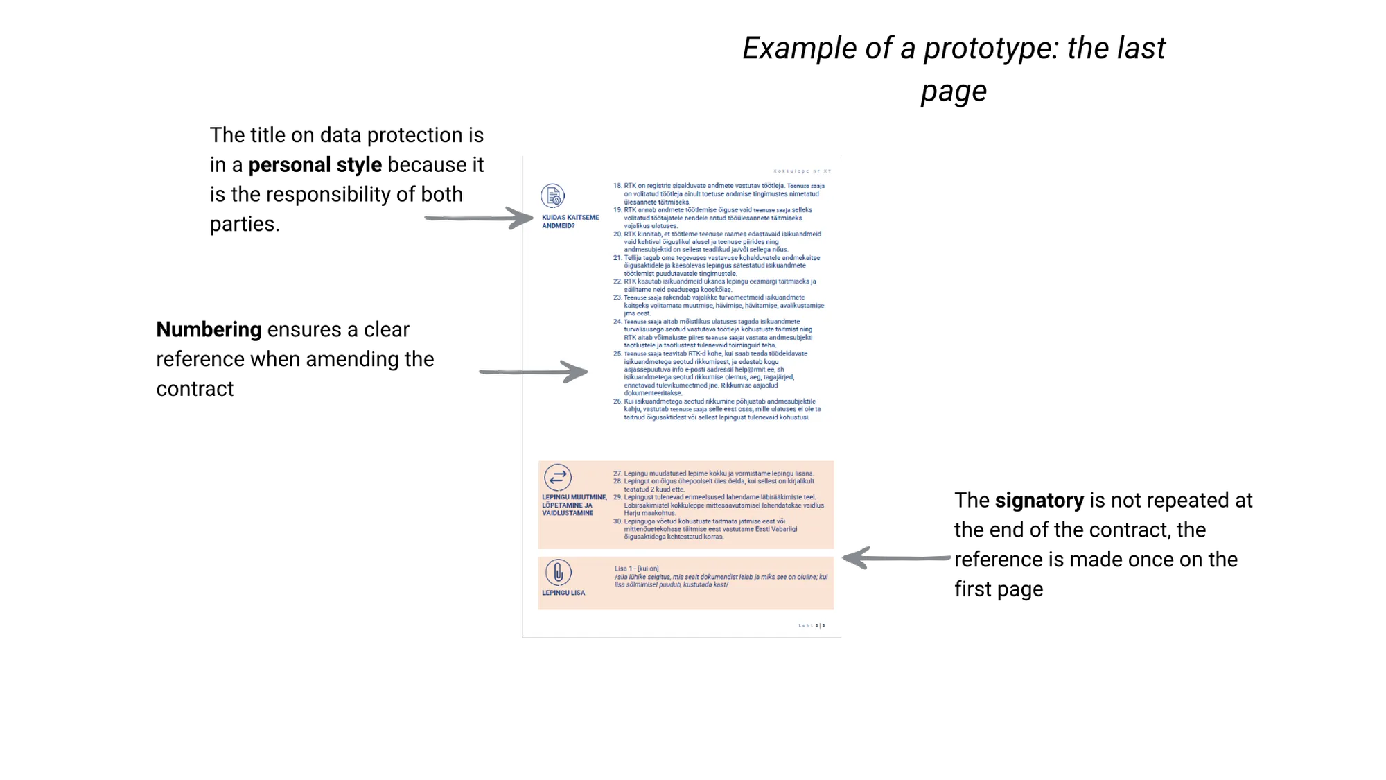 - One of the interviewees, a lawyer, was amused when seeing the colourful version of the contract. At the same time, the interviewee pointed out that it is positive for the state to take the lead in such matters, since when both parties are public sector institutions, disputes remain within the system and can be resolved without court costs. This comment emerged during the prototype testing phase, where such reactions and feedback provided valuable insights for refining the prototype.