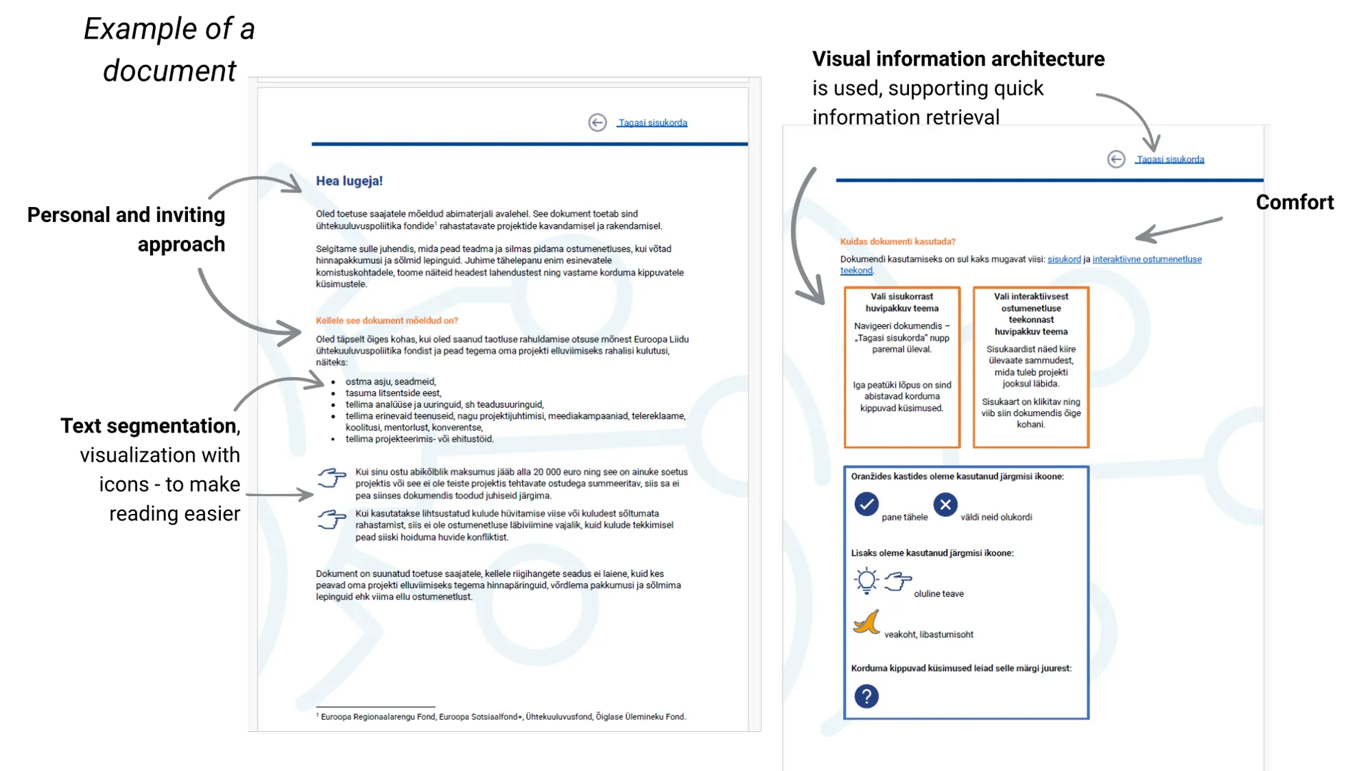 At the State Shared Services Centre (SSSC), which manages European Union funds in Estonia, we have begun to apply legal design systematically. Over the past two years we have worked with ministries, implementing agencies, and users in design sprints to rethink the way of working and creating services, legal acts, and information materials. In the following pages, we share two case studies where legal design and information design were used to transform complicated regulatory materials into clear and user-friendly guidance by using plain language, clear structure, and visual tools. These examples show how even small changes in design can remove barriers, reduce frustration, and make the grant application journey smoother and more accessible.