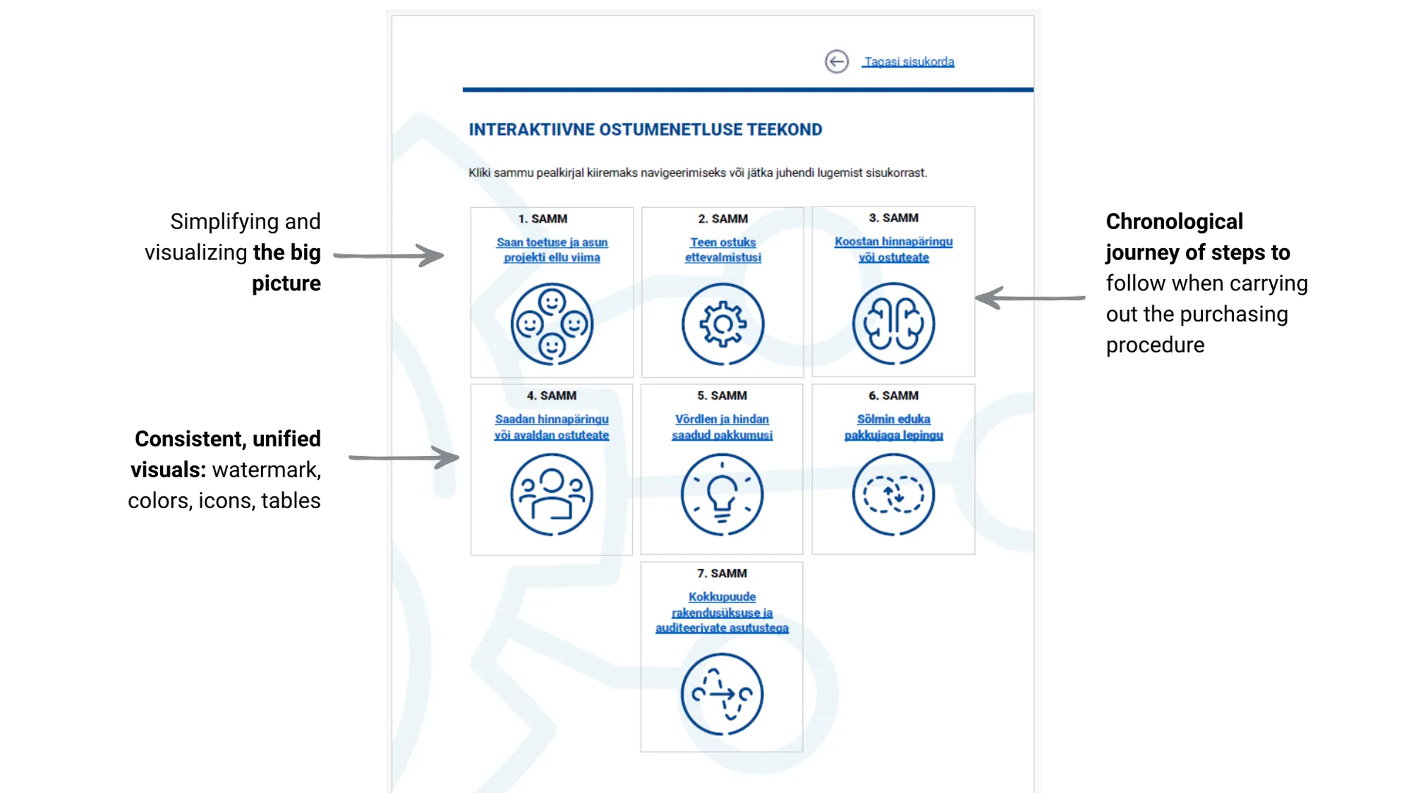 During the sprint, the team focused on designing an information-designed guide specifically for grant recipients so that the guide would precisely meet the most important target group’s needs. In fieldwork, the team conducted nine interviews with both grant providers and recipients. Interviews revealed that many grant recipients did not know they were required to follow purchasing procedure. Second, guides were not searched for where they had been placed on the website, and the search engine did not support finding the guide. Third, it was confirmed that the information in the previously used guide was unclear and difficult to locate for grant recipients. Therefore, the goal was set to create a step-by-step guide rather than legal explanations—a guide that: