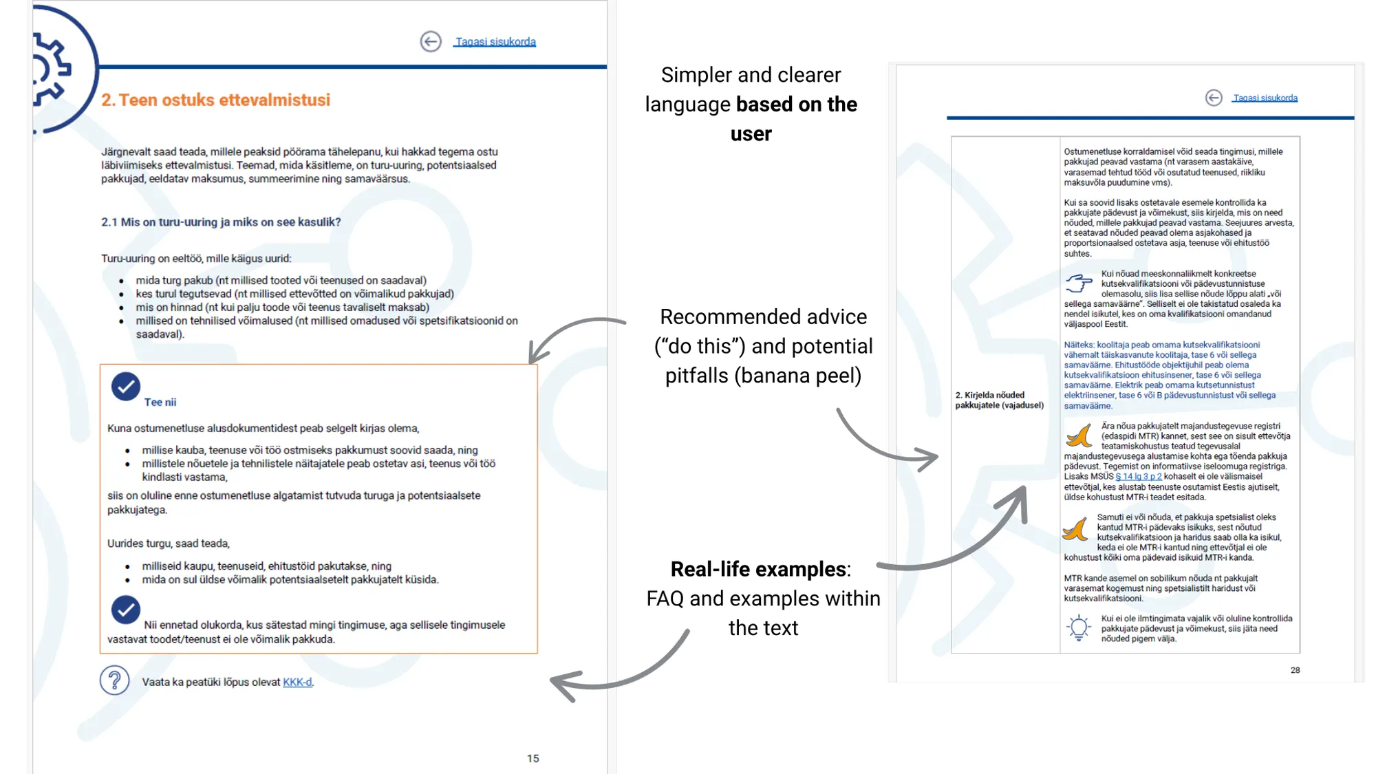 In the world of grants rules cannot always be changed. However, even if the rules can’t be changed, they can be made understandable. Very often these rules originate from several different regulations and are cross-referenced with one another, which makes them even harder for applicants to follow. In addition, established practices or existing interpretations may shift over time and can further influence how the rules are applied, adding yet another layer of complexity. At the same time the financial cost for making a mistake in the purchasing procedure can be severe for grant receivers. Moreover, people should feel confident and supported rather than lost or intimidated. As rules in the grant realm can often make people feeling overwhelmed and entail several risks of compliance, it is exactly where fieldwork such as user interviews, testing alongside with beginner’s mindset, and a desire to listen to the user can be a gamechanger. This helps create information that is clear, functional, and easy for users to understand and act on while also reducing errors and mitigating risks.