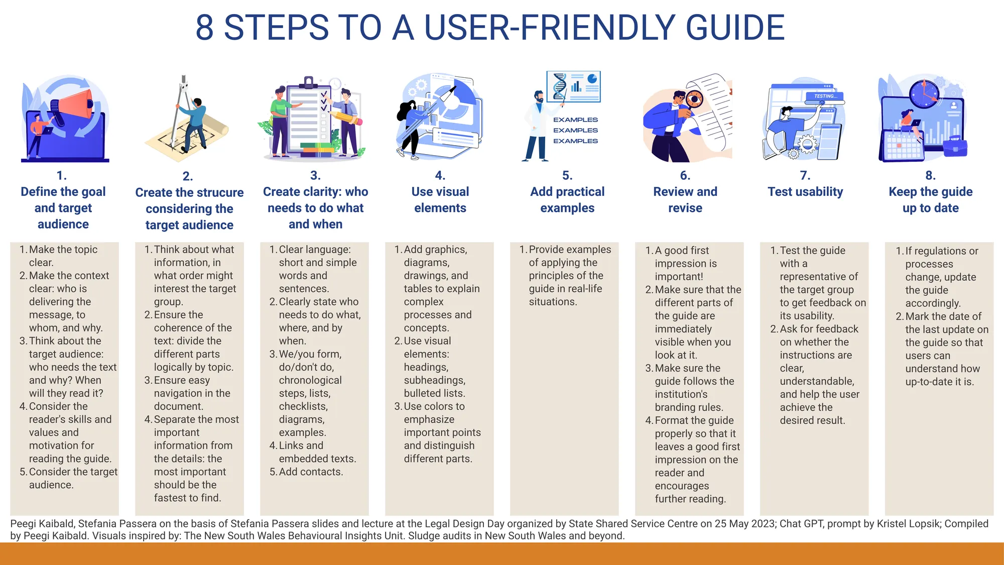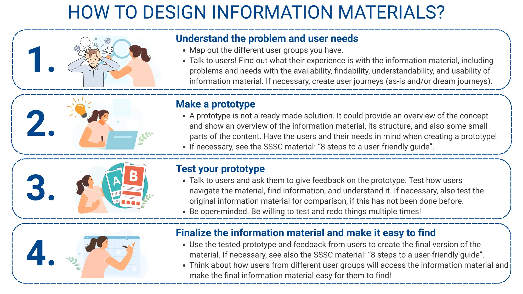 The second information design sprint stemmed from autumn 2024 to spring 2025. The 81 people in sixteen teams from nine institutions co-created 16 new user-friendly materials, from guides and contracts to websites and social media posts. Participants first interviewed users to learn about their pain points, frustrations, expectations in finding and using the information materials. Then they learned about plain language and information design principles including the 8-step guide to user friendly guide (see Figure 6). The teams created prototypes and tested them on users as part of the design process (see Figure 7). Many of these information materials are already in use, while others are being refined further[1].