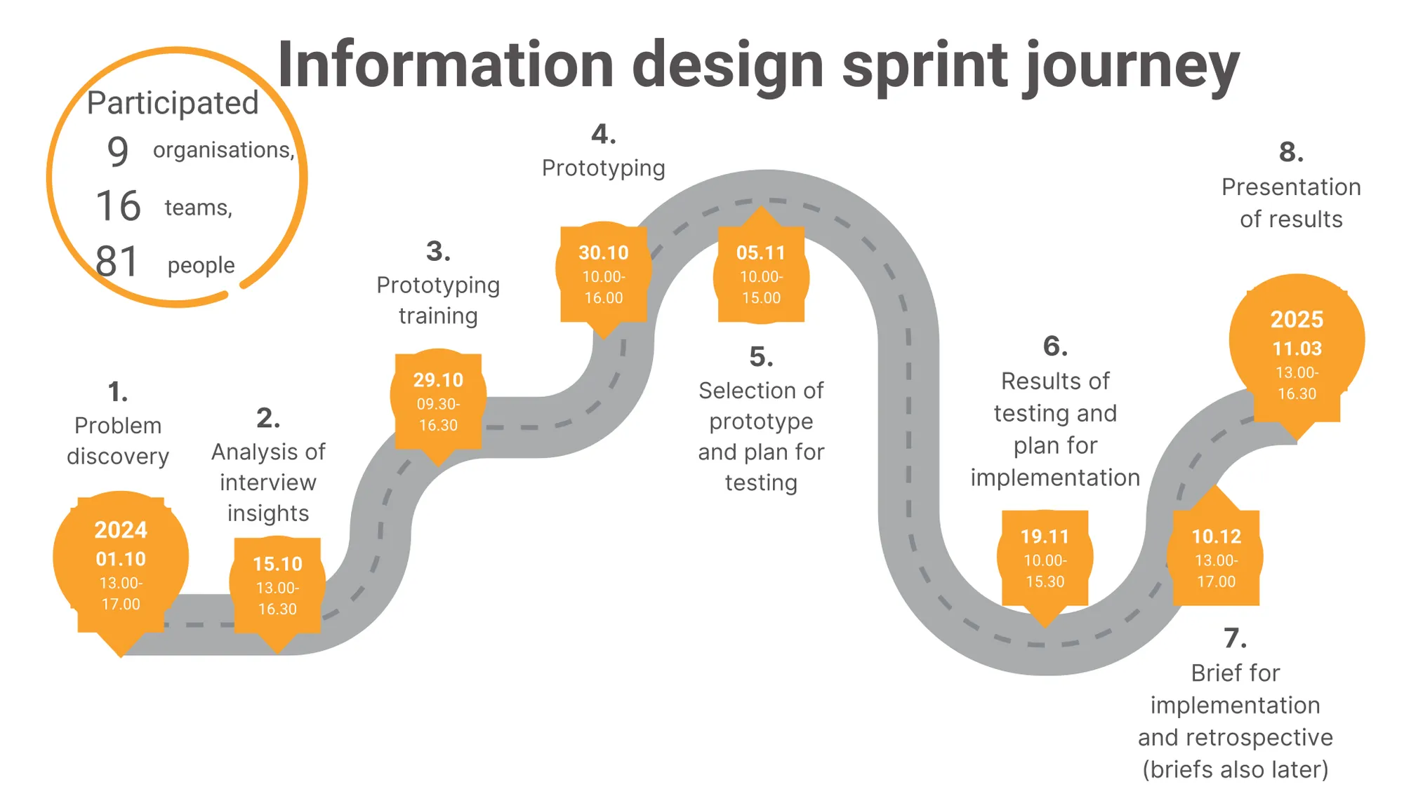 Figure 7. The timeline and process of the SSSC’s 2nd information design sprint from autumn 2024 to spring 2025
